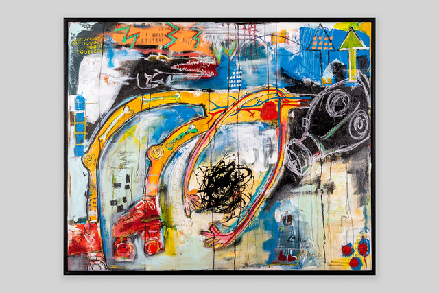 Acrylic, oil, pastel, paper, crayon, enamel on canvas, 91 × 122 × 3.5 cm...
