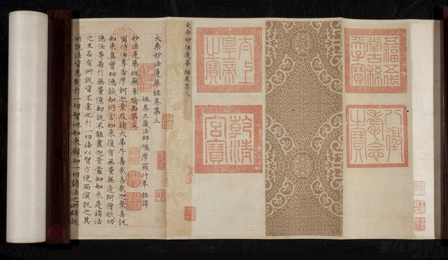 Printed during the twelfth century, this scroll, together with the seven others from the set, contain the text of the Lotus Sutra (Chinese, Miaofa Lianhua Jing; Sanskrit, Saddharma...