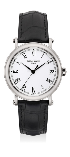 Title: Patek Philippe, A fine and very rare limited edition white gold wristwatch with Officier-style case, date and sweep center seconds, limited edition of 25 examples made for the 150th Anniversary of Andreas Huber (2006)