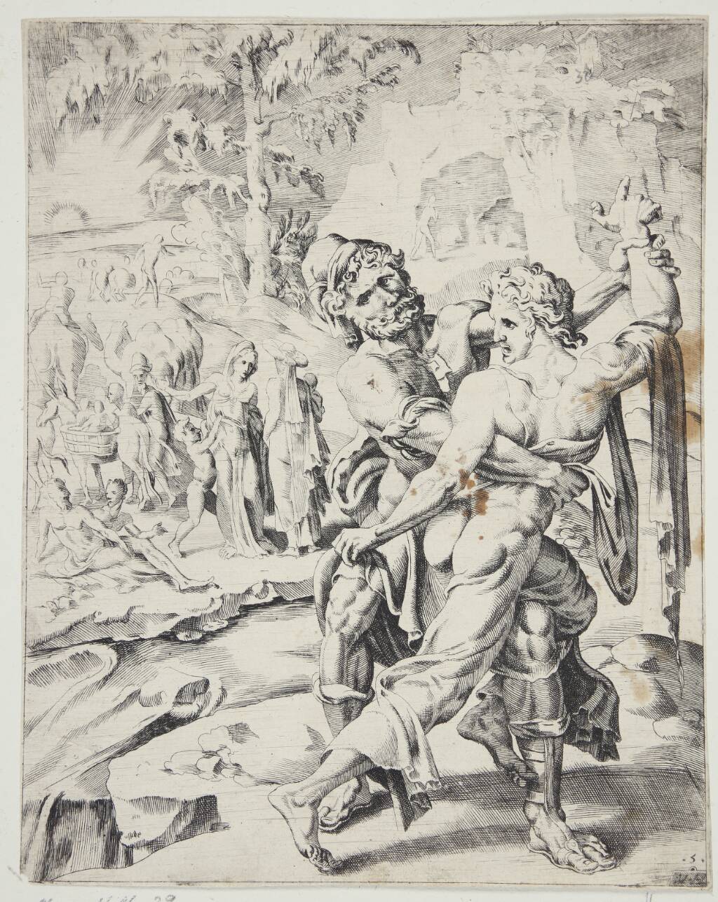 in medallions at top, left: Jacob asking Laban for Rachel's hand after seven years [Gen. 29:20-21], center: Jacob wrestling with the angel [Gen. 32:24-25], right: the reconciliatio...