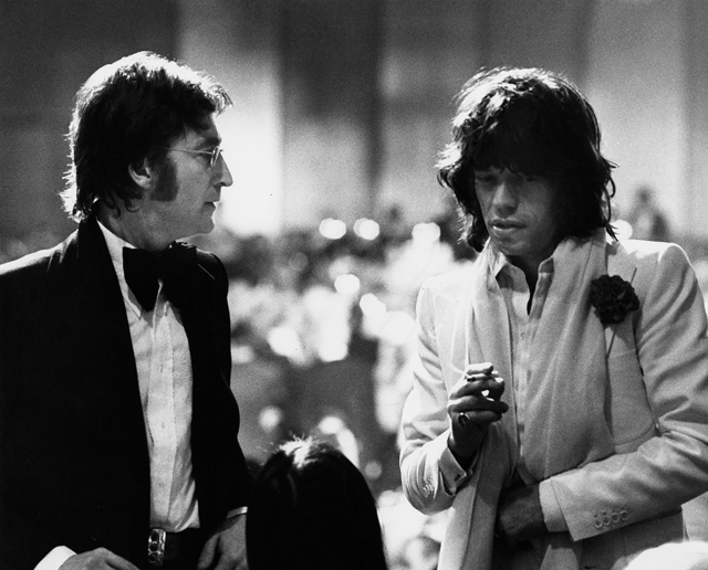 Ron Galella, John Lennon and Mick Jagger at American Film Institute Salute to James Cagney at Century Plaza Hotel in Los Angeles (1974)