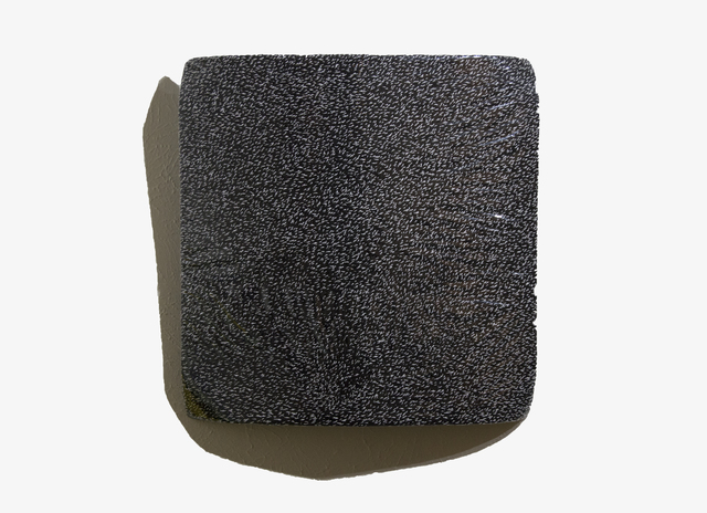 Plastic film, thread, and throw fabric on board, 20 × 20 × 4 in.