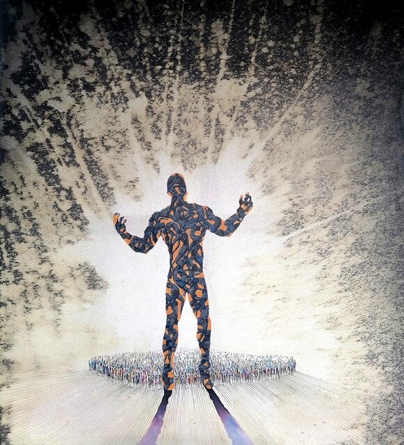 Mixed media (acrylic, bleach) on denim, 40 × 39 × 1 in.