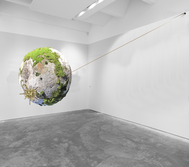 Paper pulp, wood glue, concrete, wood, glass beads, stone, rose quartz, gourd, and jewelry, 87 × 17 × 22 in...