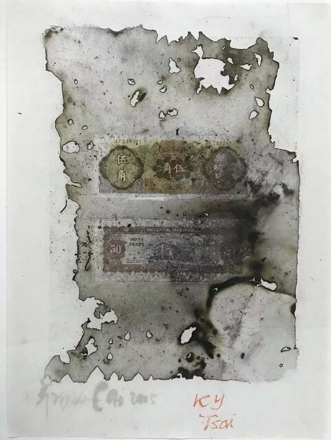 Gunpowder explosion, Taiwan dollar bills, mounted on Paper, 38 × 28 cm...