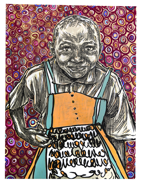 Block print and acrylic gouache on paper and wooden painters panel, 40 × 30 × 1 1/2 in.