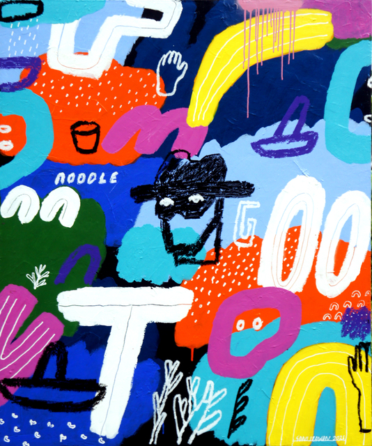 Acrylic, oilbar, spray paint, paint marker on canvas, 120 × 100 × 5 cm.