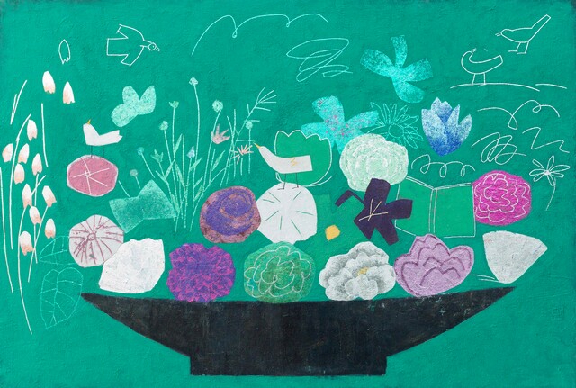 The intense color and shading in undulating bands convey a lushness and musical resonance that together define a highly innovative approach to landscape painting. The artist’s insc...