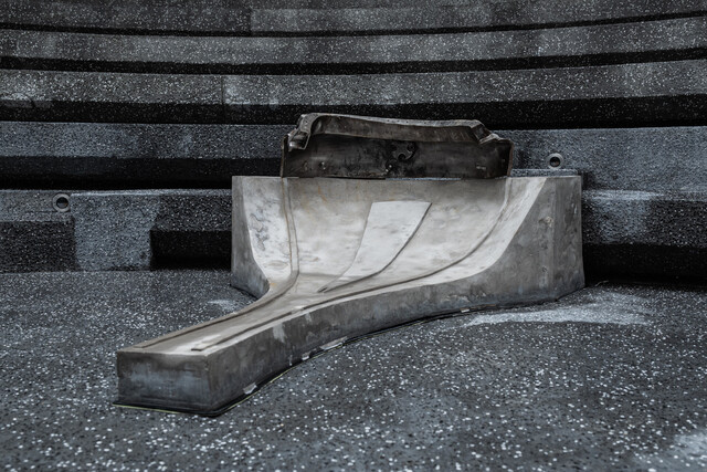 Rocket debris steel body, concrete, iron, 256 × 175 × 55 cm.