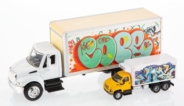 Printed art on plastic and metal truck, 3 2/5 × 2 1/4 × 8 1/4 in...