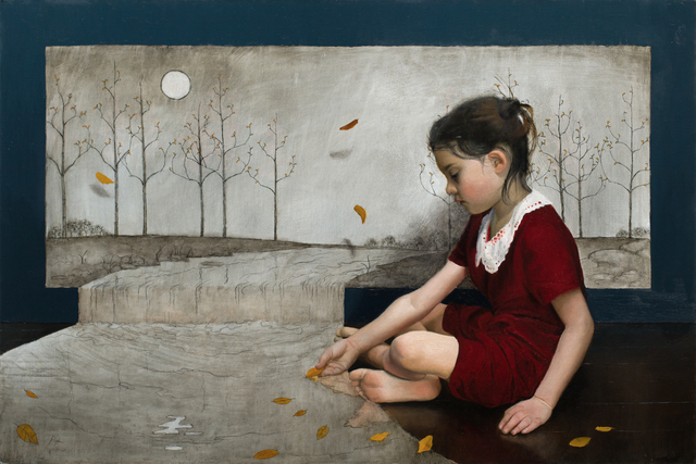 Oil and ink on linen mounted panel, 20 × 30 in.