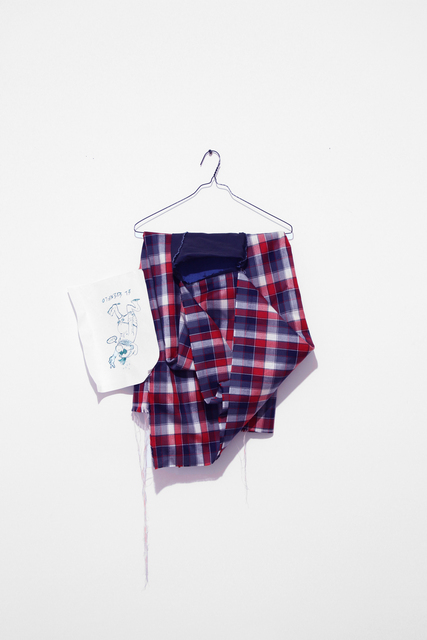 Mixed media: paper, fabrics, hanger, 38 × 26 × 3 in...