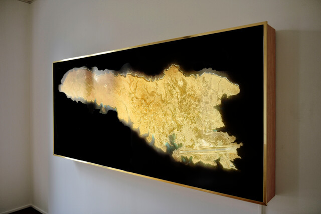 Caisson lumineux, plexiglas, bois, luminaires, 111 × 241 × 21 cm.