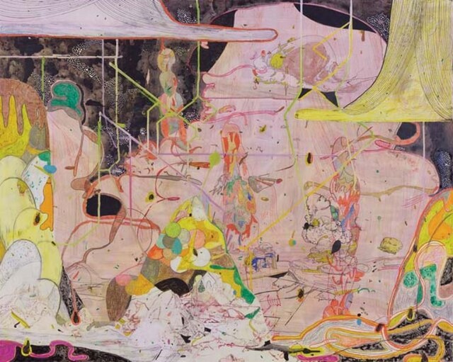Acrylic, ink, gesso, pencil, varnish on plywood panel, 80 × 100 cm.