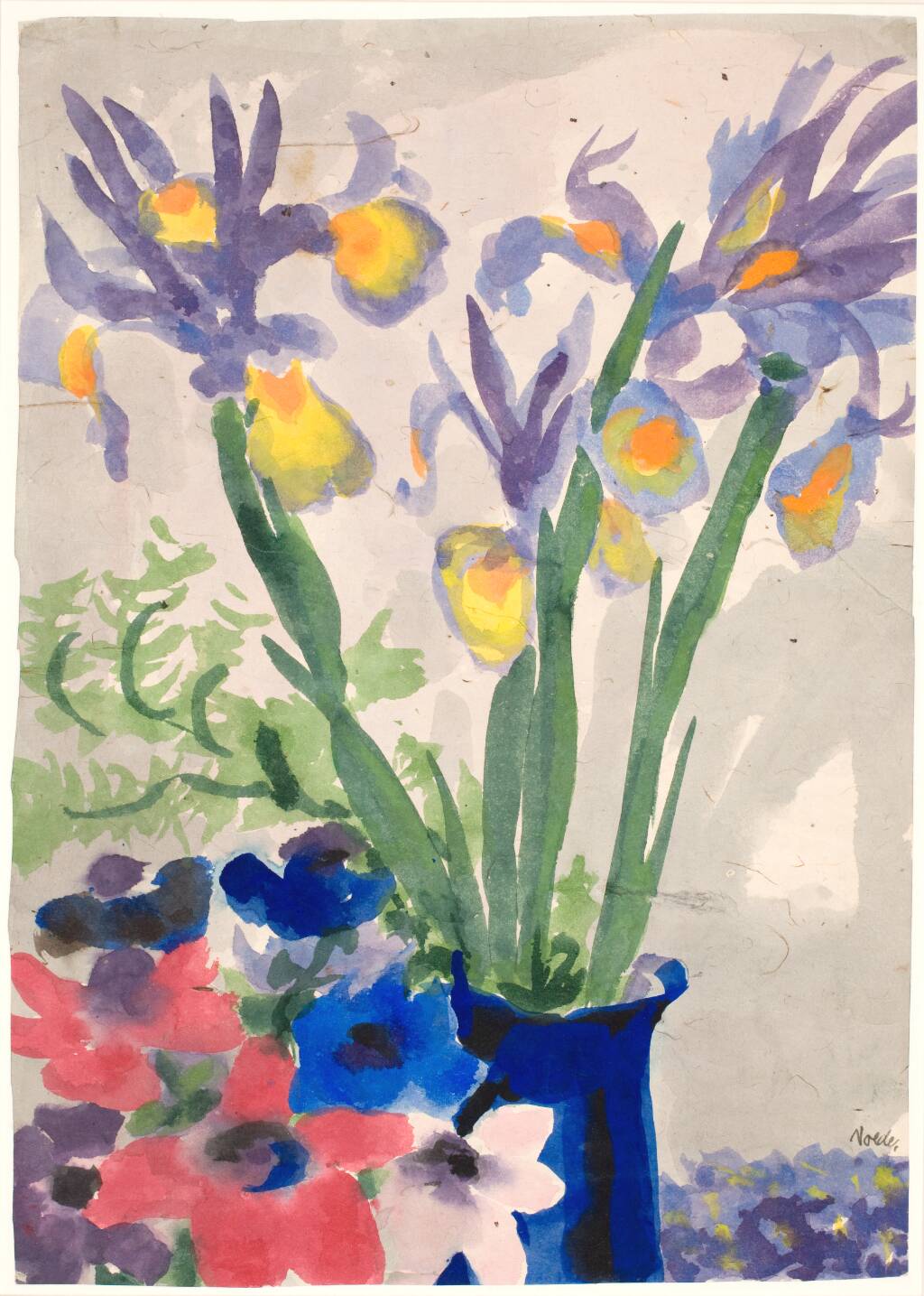 Franske anemoner og blå liljer i et blåt glas