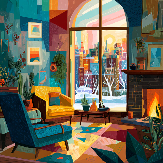 Neo Bauchaus, "Quiet Evening by the Window", contemporary painting, interior scene, modern interior, cozy interior, winter view, cityscape, urban landscape, window view, fireplace, home atmosphere, domestic space, modern art, geometric forms, colorful pa