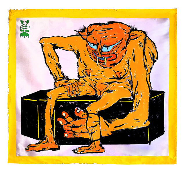 Acrylic on satin, 72 × 79 cm.