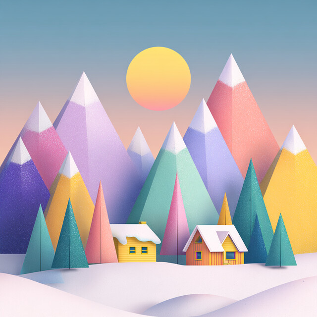 Title: Elias Soederberg, "Scandinavian Mountain Dream", pastel mountain painting, geometric landscape art, modern mountain artwork, mountain sunrise painting, Scandinavian landscape art (2025)