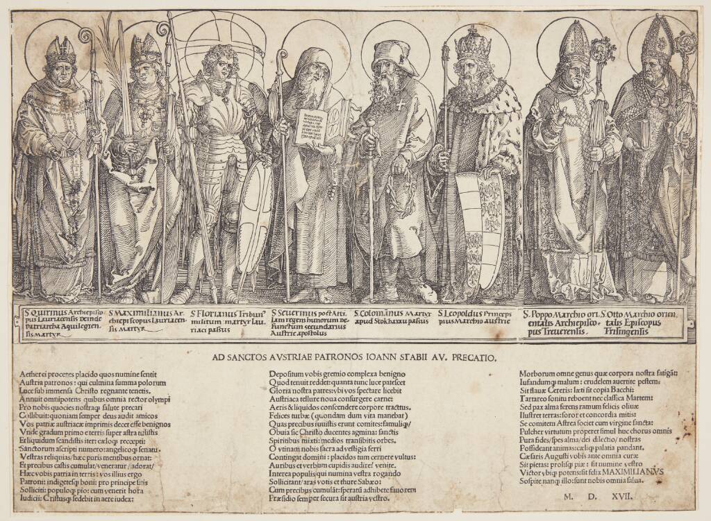 Bladet er trykt fra to stokke, skåret på forskellige tidspunkter. Fra den første stok, der kun afbilder seks helgener, er trykt blade med dateringen 1515. Siden er der føjet en stok til med endnu to helgener og aftryk fra disse stokke bærer i reglen dateringen 1517