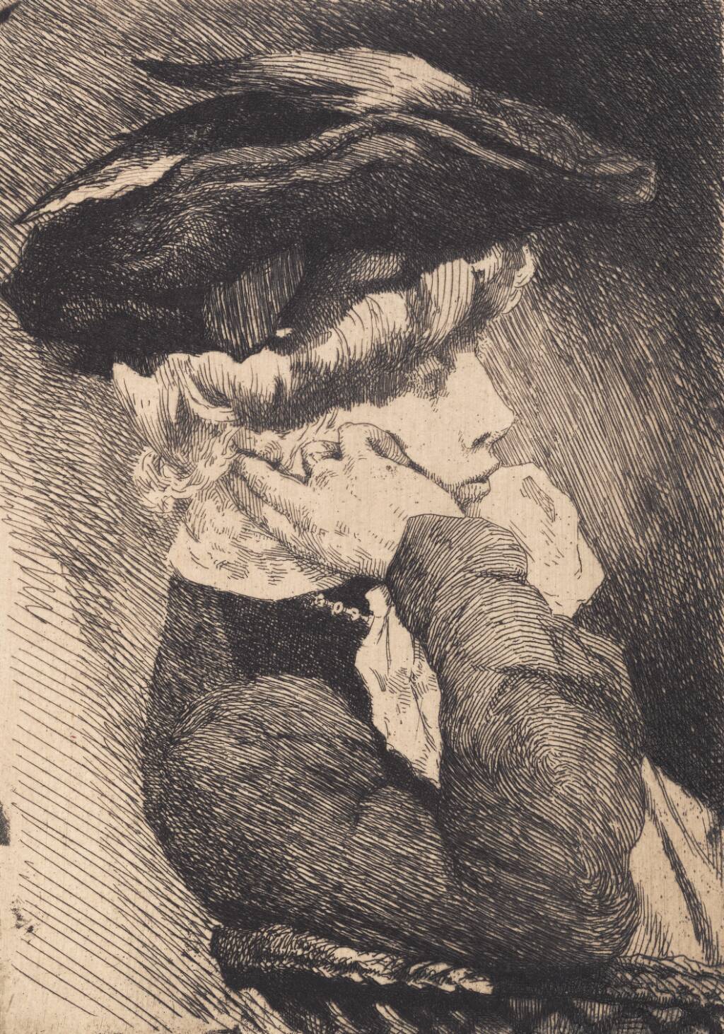 Title: Brystbillede af en siddende ung dame med hat, skarp profil