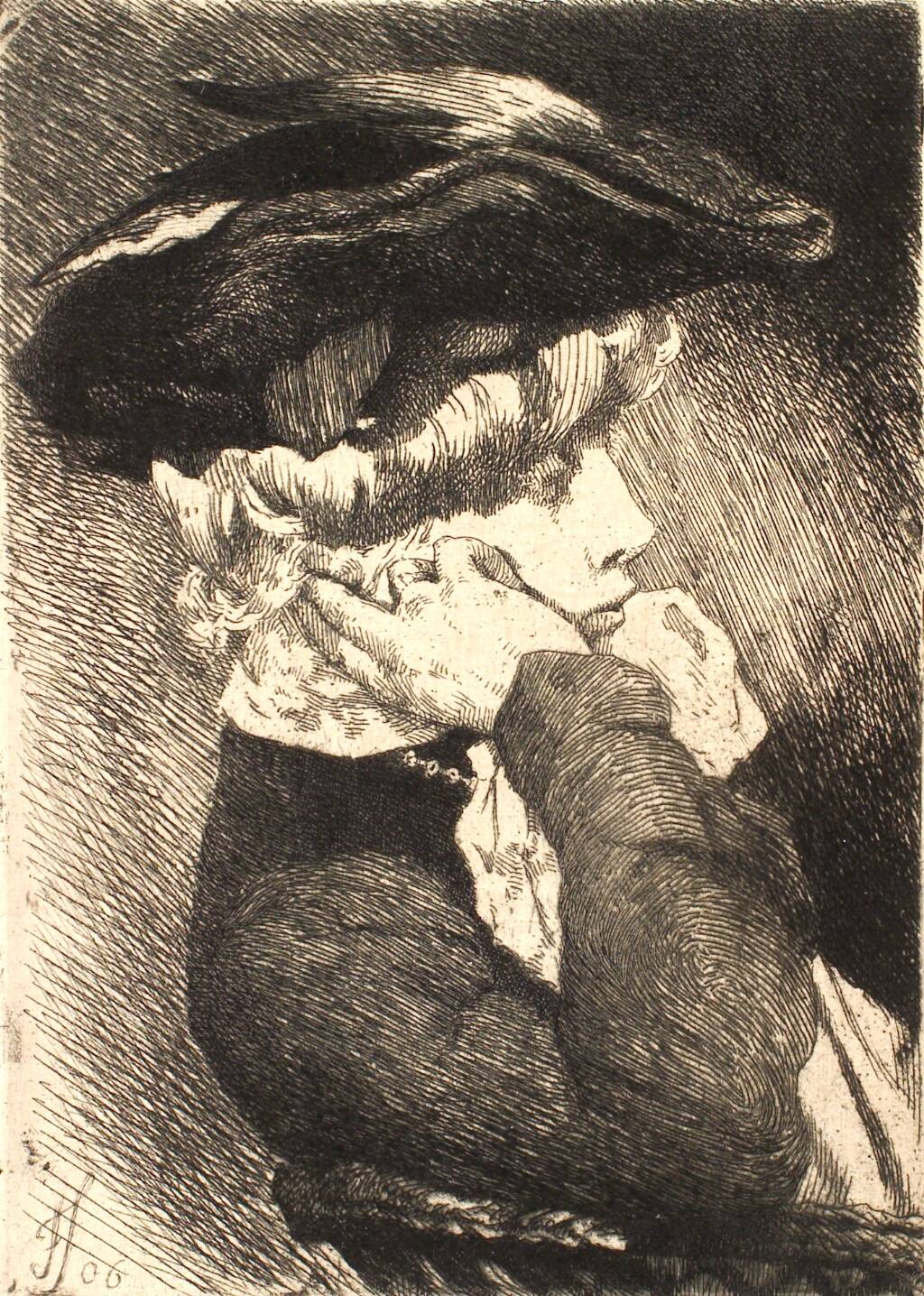 Brystbillede af en siddende ung dame med hat, skarp profil