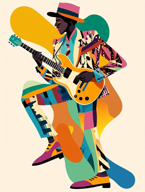 Neo Bauchaus, "Rhythm in Motion II", contemporary art, modern art, figurative, musician, guitarist, music, jazz, blues, pop art, abstract elements, geometric shapes, colorful, vibrant, dynamic composition, urban art, street style, movement, energy, rhyth