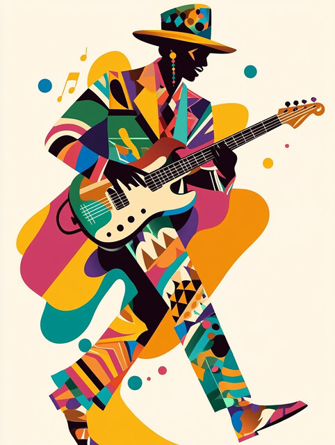 Neo Bauchaus, "Rhythm in Motion", contemporary art, modern art, figurative, musician, guitarist, music, jazz, blues, pop art, abstract elements, geometric shapes, colorful, vibrant, dynamic composition, urban art, street style, movement, energy, rhythm,