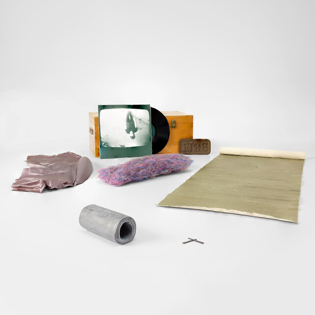 The set of six multiples, including a painting on canvas with two nails, bronze sidewalk plaque, vinyl record with screenprinted jacket, reprocessed nylon net multiple, lead multiple and a plaster multiple cast in satin, all contained in the original wooden box with brass clasps, lacking the Eva Hesse.