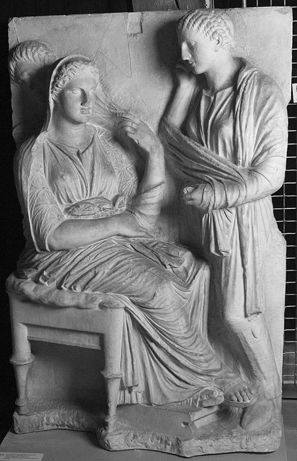 Gravrelief. Gravrelief for Arkestrate. Siddende kvinde mod h. og to stående kvinder