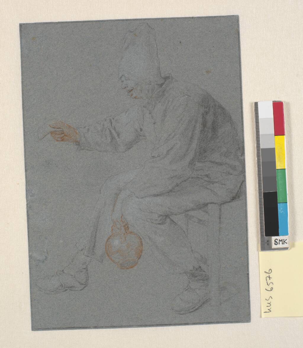 Title: En siddende bonde rækker en seddel frem med højre hånd, i venstre hånd en krukke