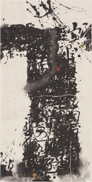 Xuan paper, ink, burn marks, and rubbing, 36 × 62.5 cm...
