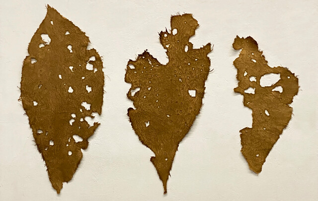 Lemon juice on unbleached cotton fabric, heated with an iron, 100 × 20 × 1 cm.
