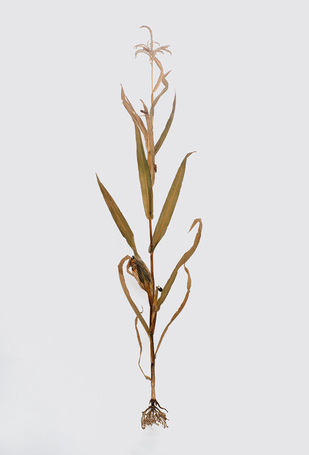 Pressed and dried plant and grasshopper, mounted on stainless steel, 269 × 70 cm.