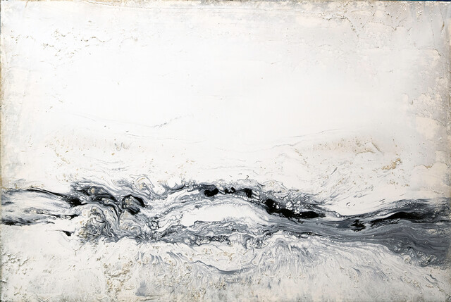 Mixed media and oil with resin on canvas, 60 × 90 × 2 in.