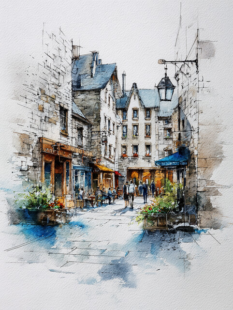 Emily Simmons, "Quiet Street II", urban landscape, cityscape, watercolor, ink drawing, street scene, old town, European city, architecture, narrow street, travel mood, atmospheric, light and shadow, warm palette, expressive lines, contemporary watercolor
