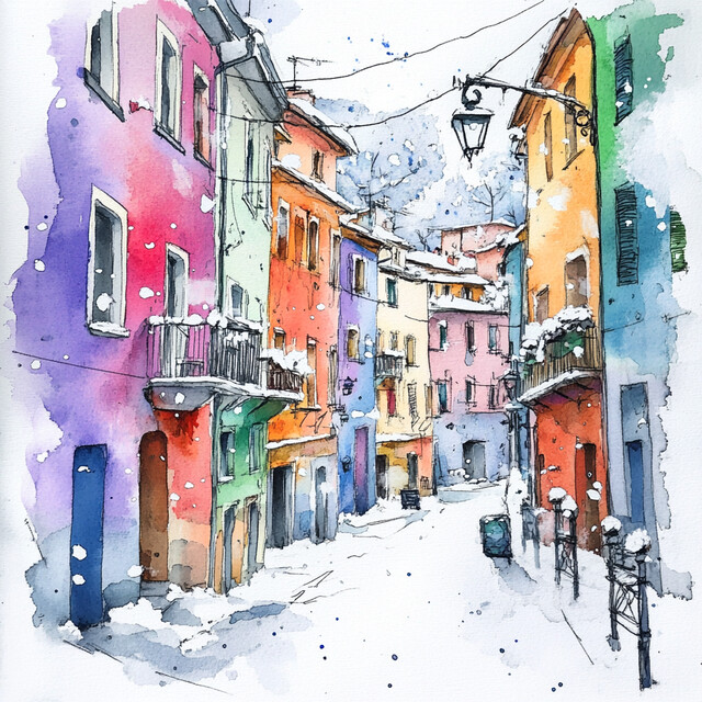 Emily Simmons, "Quiet Street II", urban landscape, cityscape, watercolor, ink drawing, street scene, old town, European city, architecture, narrow street, travel mood, atmospheric, light and shadow, warm palette, expressive lines, contemporary watercolor