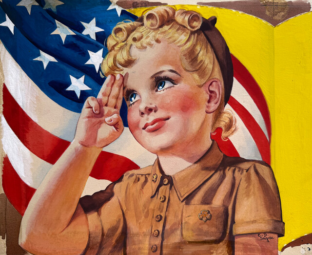 Ellen Barbara Segner, Mid Century Brownie Blond Girl Scout - 4th of July Salute with American Flag (ca. 1950)