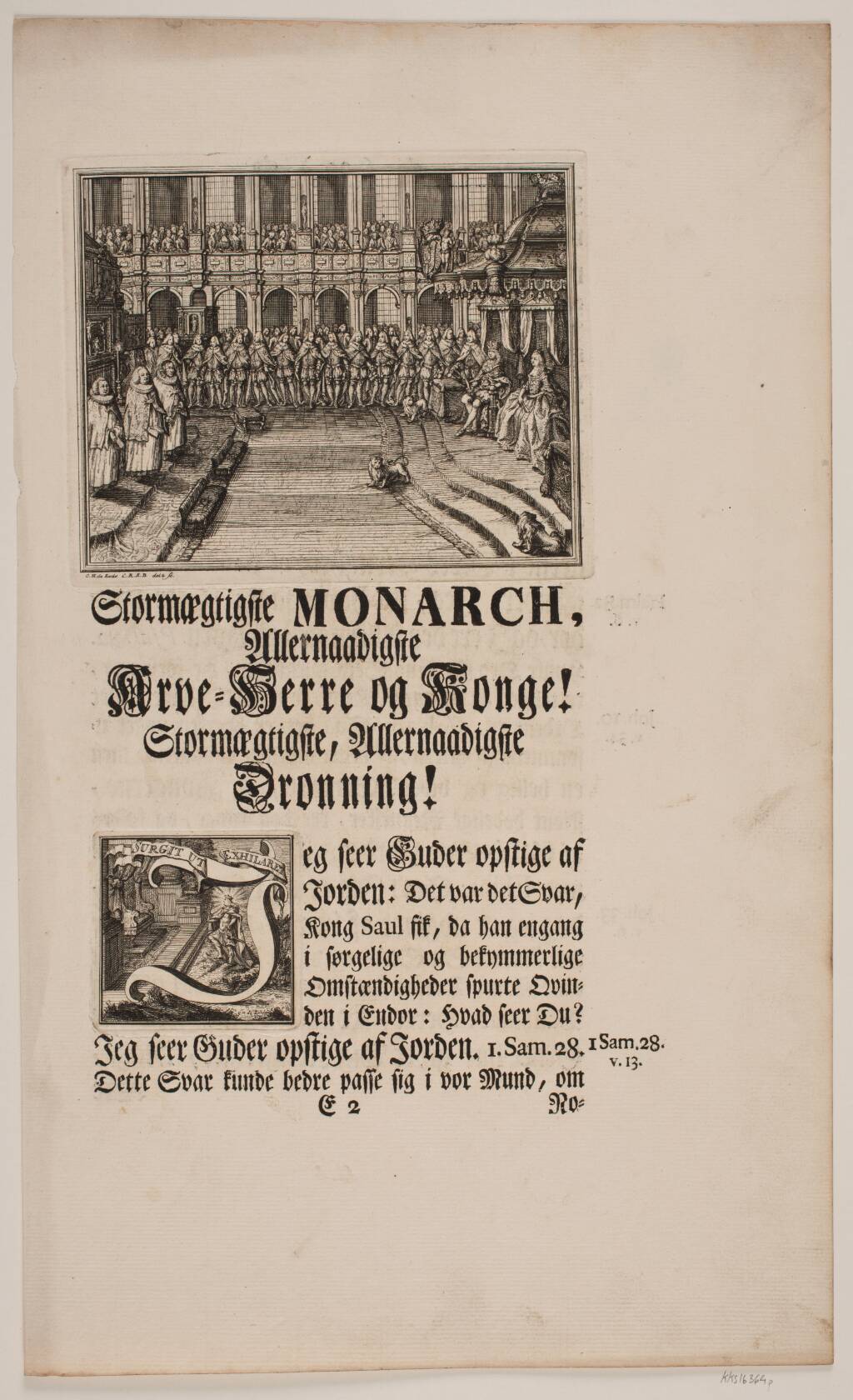 Title: Kong Frederik V og Dronning Louise under salvingshøjtidelighed i Frederiksborg Slotskirke. Illustration og Vignet til Frederik d. IV's salvingsakt