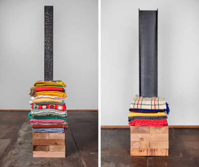 Reclaimed blankets, reclaimed cedar, steel I-beam, 84 × 50 × 16 in.