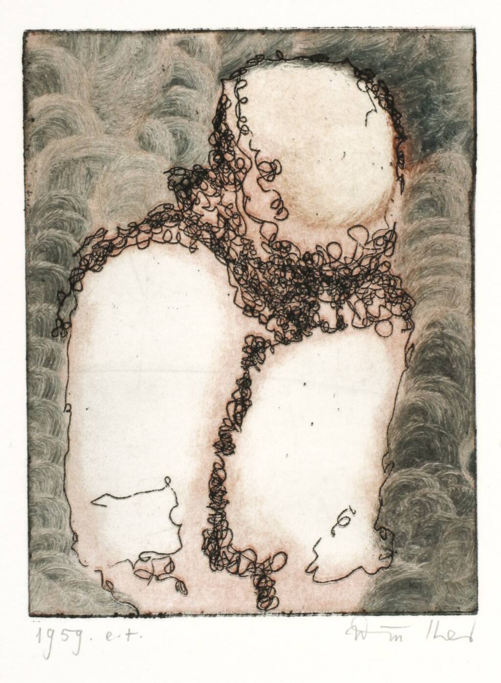 Soldat gående mod h.; på v. arm et krumt skjold, i h. hånd en lanse; t.h. en sokkel med et kuglerundt, frontalt set hoved; i det fjerne bag hovedet en by ved vandet