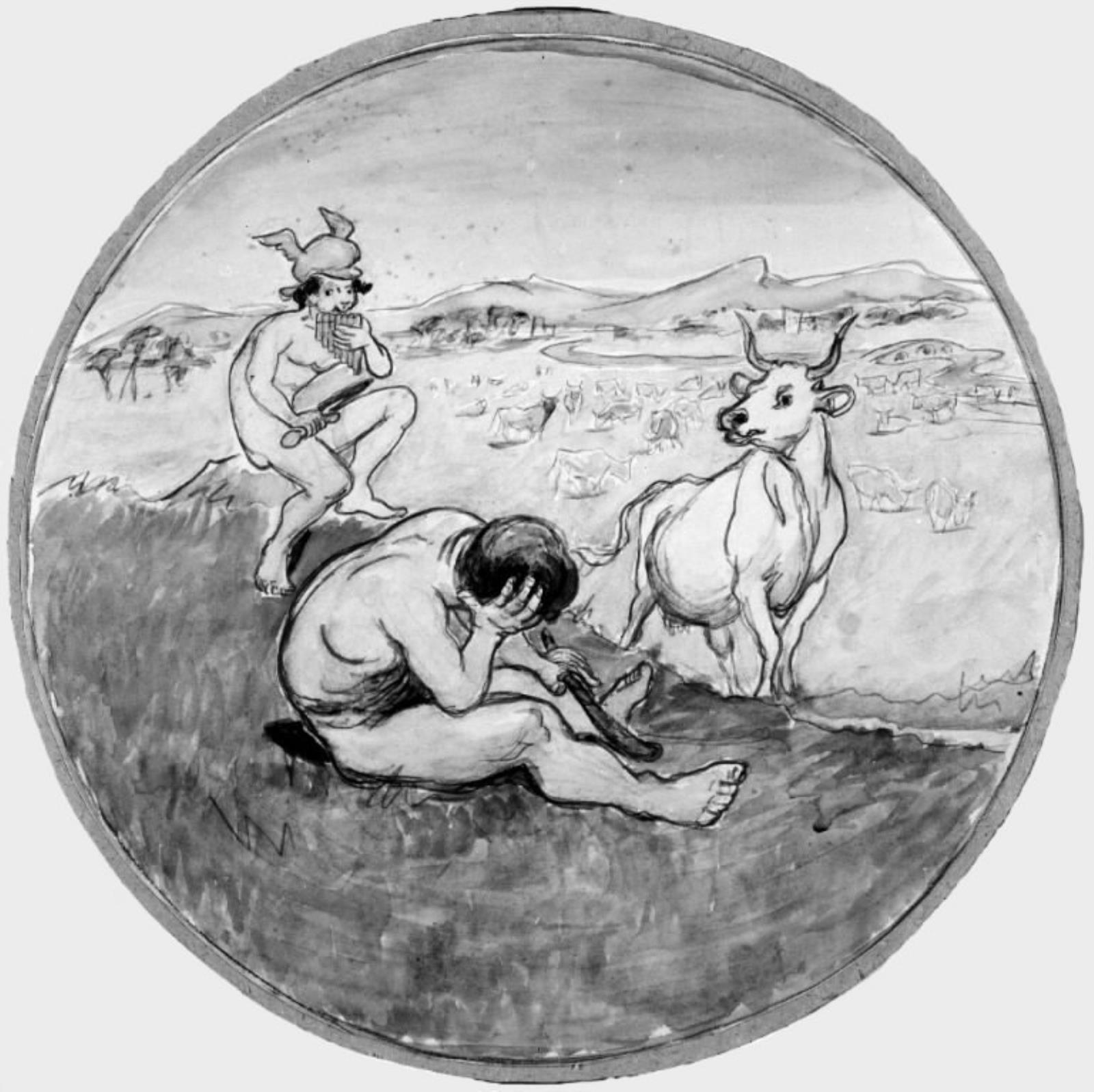Title: Merkur har ved sit fløjtespil dysset Argus i søvn, medens han vogtede den til en kvie forvandlede Jo