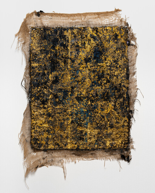 Tar, gold leaf, acrylic paint on hessian, 94 × 74 cm.