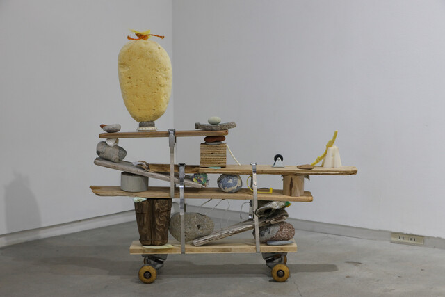 Wood, flotsam, iron, wheels, stones, 27 × 48 × 14.
