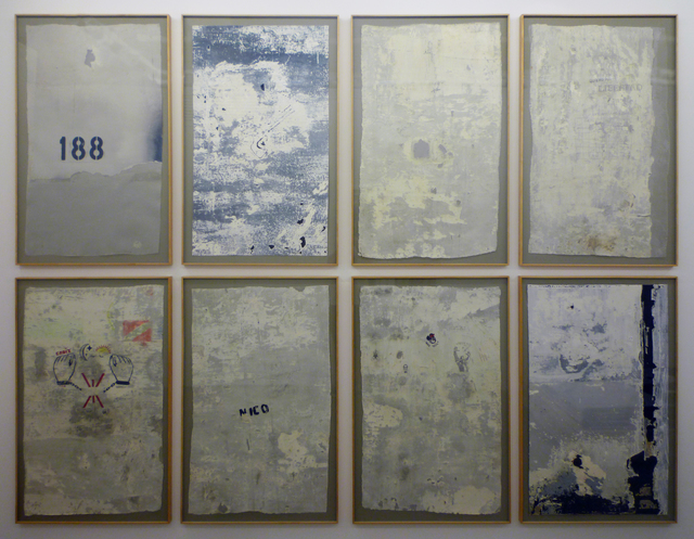 6 Wall-prints on transparent fabric capturing writings and drawings left by former prisoners on the walls of the cell and 2 wall-prints on black fabric capturing marks and architectural details of the cell, 100 × 60 cm.