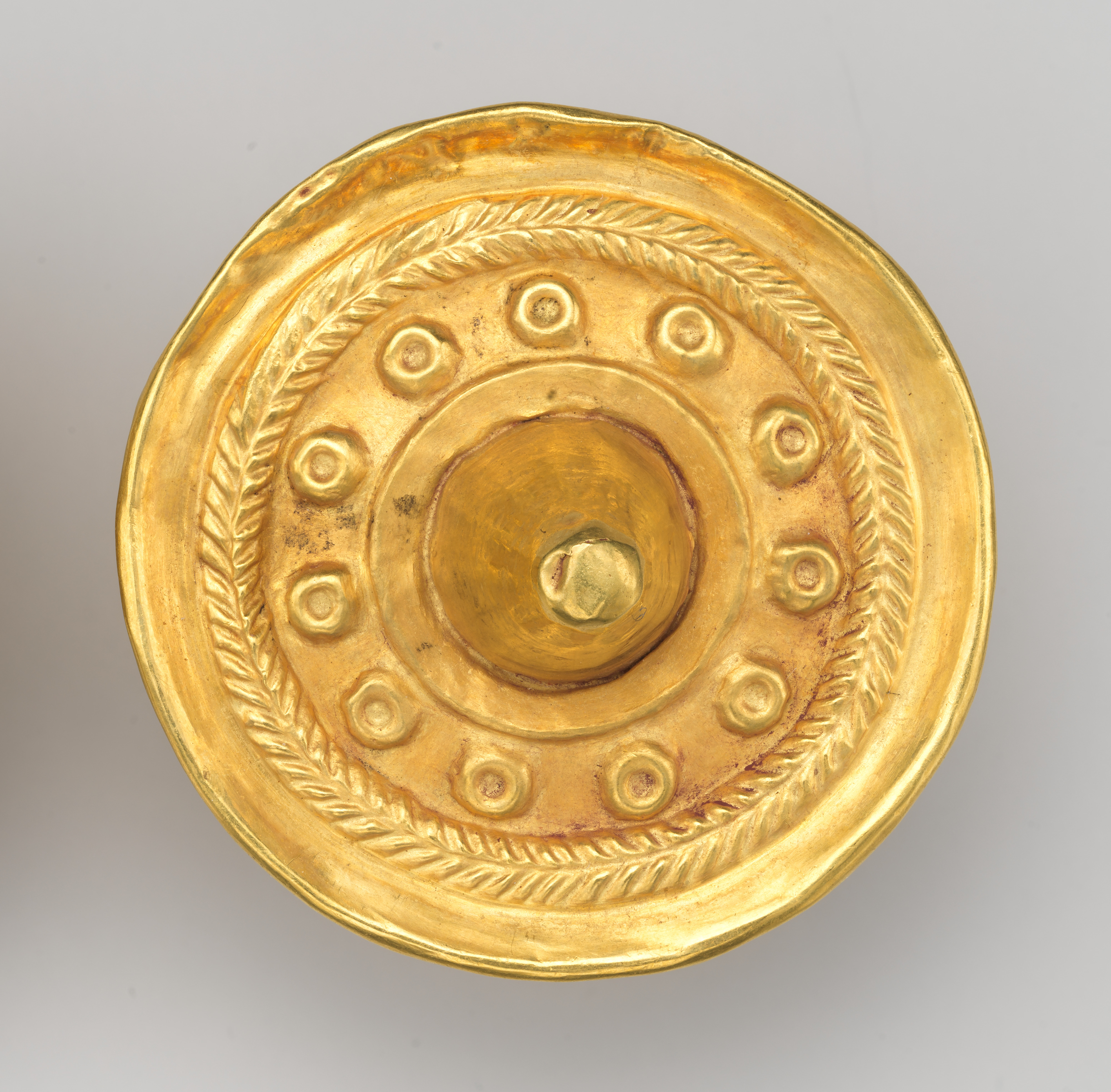 Plain bowl with bright-cut band near top and fluted on lower third; bright-cut empty lozenge on both sides. Two large cast ear-shaped handles. Spool-shaped stem on raisted circul...