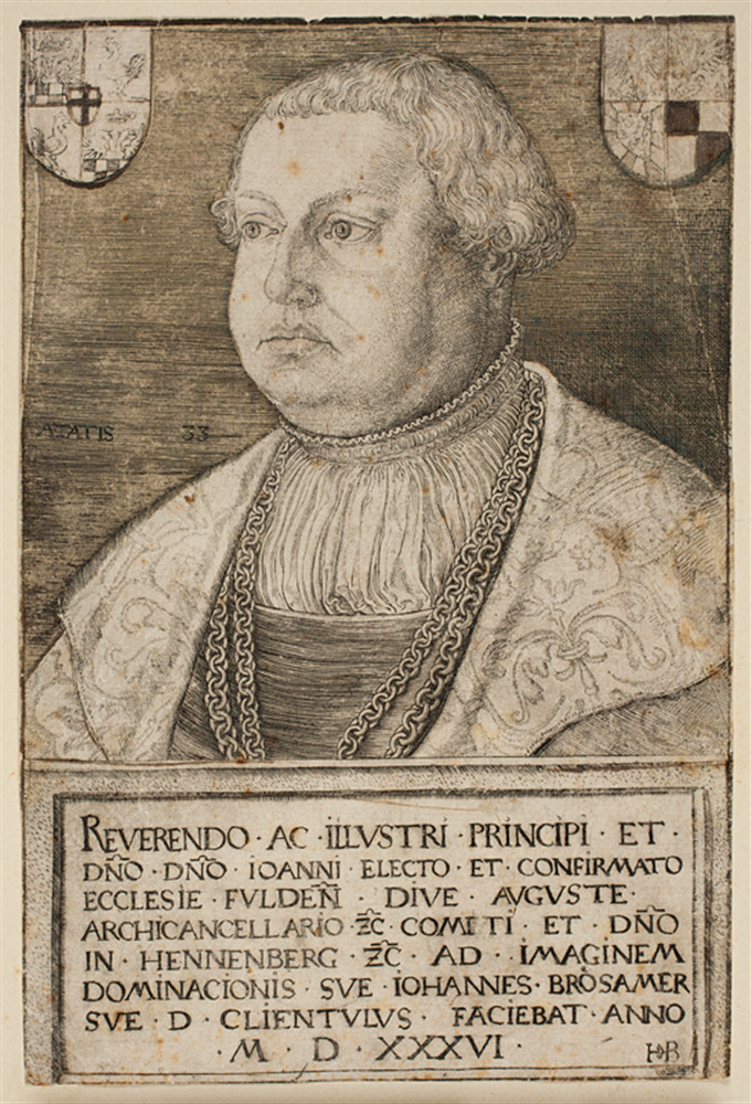 Full figure, phase left. Deeply ringed dress of yellow and white silk with gold stripes, pearl necklace and red robe. Sandals with blue ribbons. Landscape Rear, e.g. a Fountain.