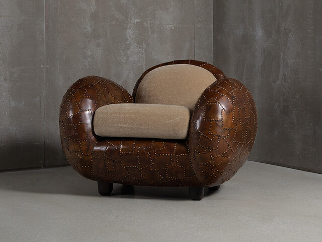 Carved and stained ash, leather, 39 × 60 × 24 in...