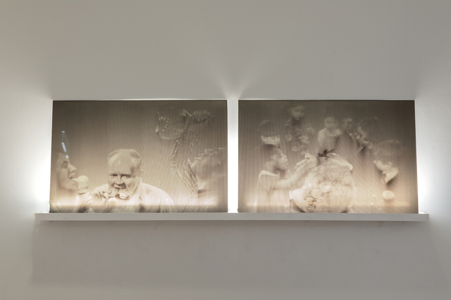 Two parallax barrier multi-scopic prints on glass, programmed LED tubes, 41 × 122 cm.