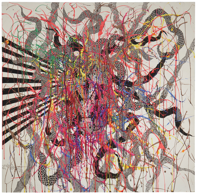 Ink, watercolor, and ultraviolet varnish on paper mounted to wood, 48 × 48 in.