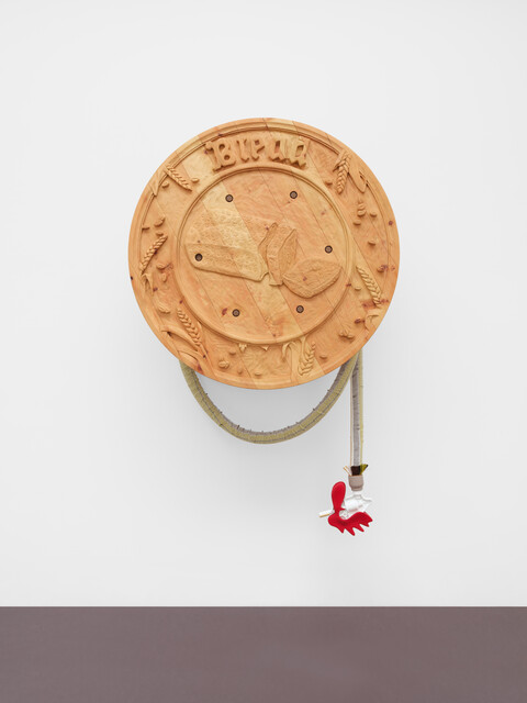 Carved and oiled Swiss pine wood, painted steel, hand painted and rubber dipped 3D printed Nylon SLS, hand painted sand cast aluminium, custom weave viscose, polyester and cotton, tubing, leather, 142 × 90 × 35 cm.
